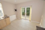 Cream marble effect tiled floor, tiled surrounds, stainless steel one and a half bowl sink unit with mixer tap and drainer, brown gloss speckled work surfaces, light brown wood effect cupboards and drawers, three glazed cupboards, built-in electric oven with gas hob, stainless steel extractor hood, built-in dishwasher, built-in fridge, radiator, recessed halogen spotlights. UPVC double glazed window to side. Door to Inner Hall. UPVC double doors to Rear Garden.