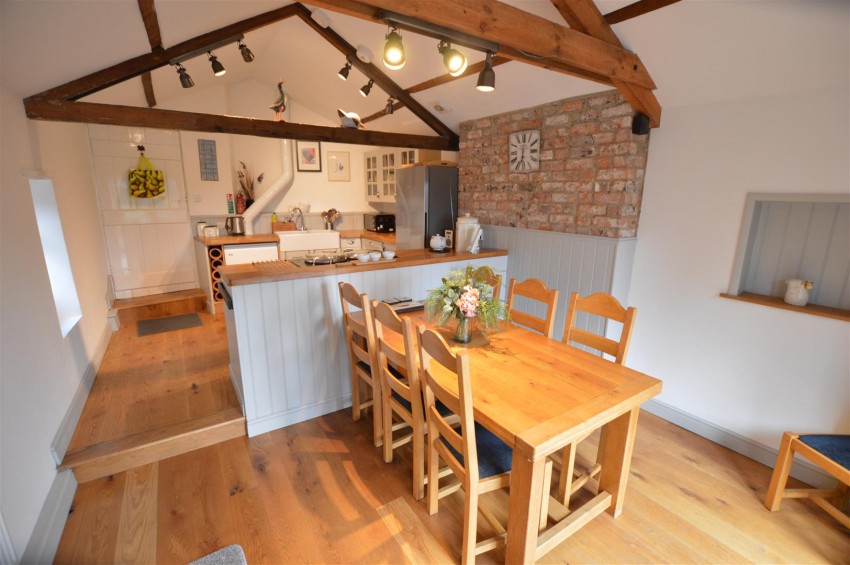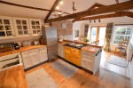 Open beamed ceiling with spotlights, ceramic double sink unit, solid oak worktops, oak boarded floor, Farrow and Ball Palladium Grey cupboards and drawers, fitted ESSE electric range with double ovens, separate warming oven and double ceramic hob with covers, built in SMEG dishwasher, fridge/freezer space, GRANT oil fired combi boiler, feature natural brick chimney breast, half pine panelled walls, radiator. Double glazed double doors to Rear Garden. Double glazed windows to side and rear. Pine door to Lounge.