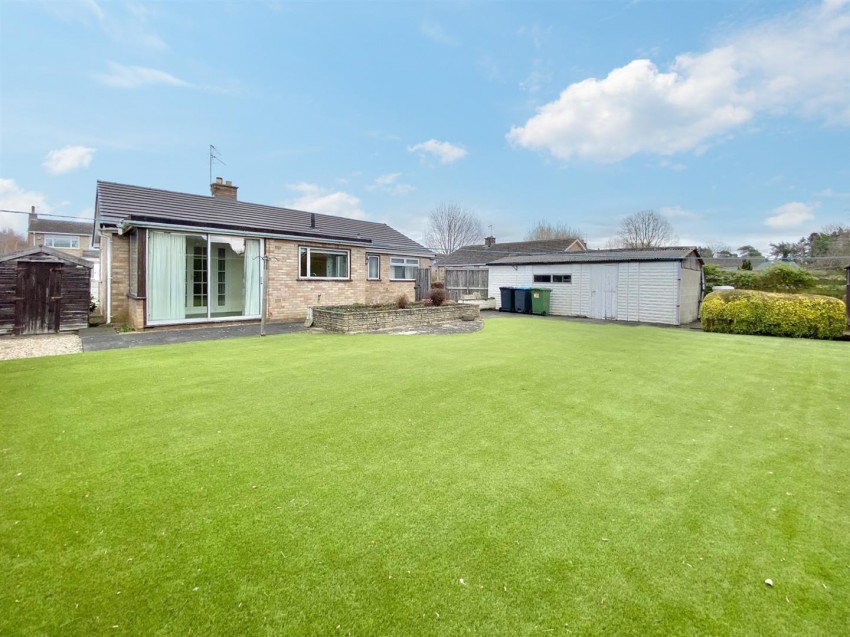 There is an attractive lawned frontage with shrub borders and paved pathways with a driveway to the side providing off street parking leading to a detached garage. There is gated access to the rear garden which a paved seating area off the garden room that extends across the rear of the bungalow and is also accessed by the kitchen. The patio looks out over an artificial lawn with planted borders and hedged boundaries. The garage has a personal side door, lighting and power points, plus an up and over door and to the rear of the garage is a garden shed providing extra storage.